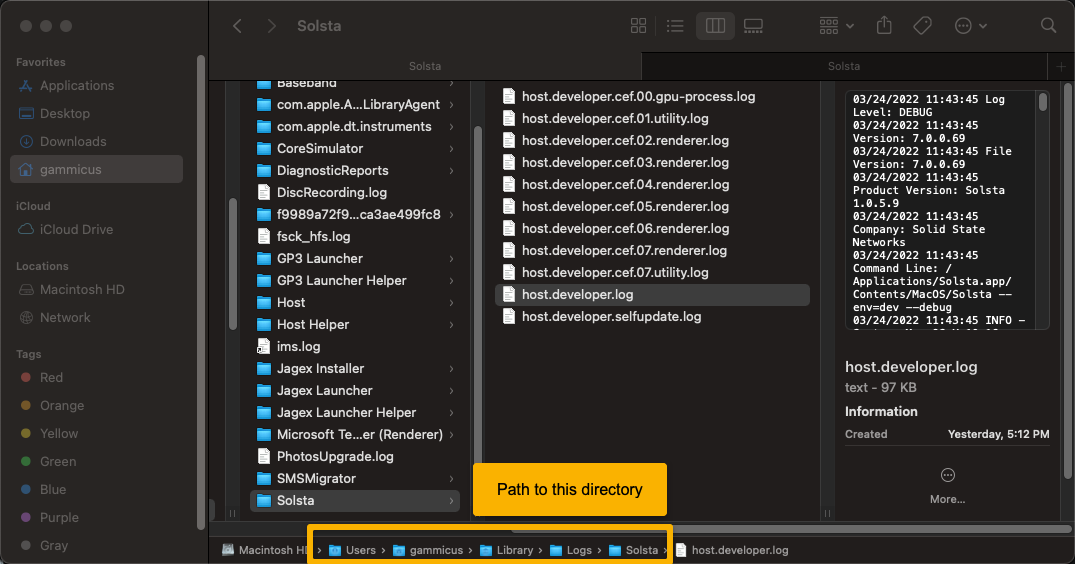 /Users/username/Library/Logs/Solstathen click Go - Grab or copy host.developer.log