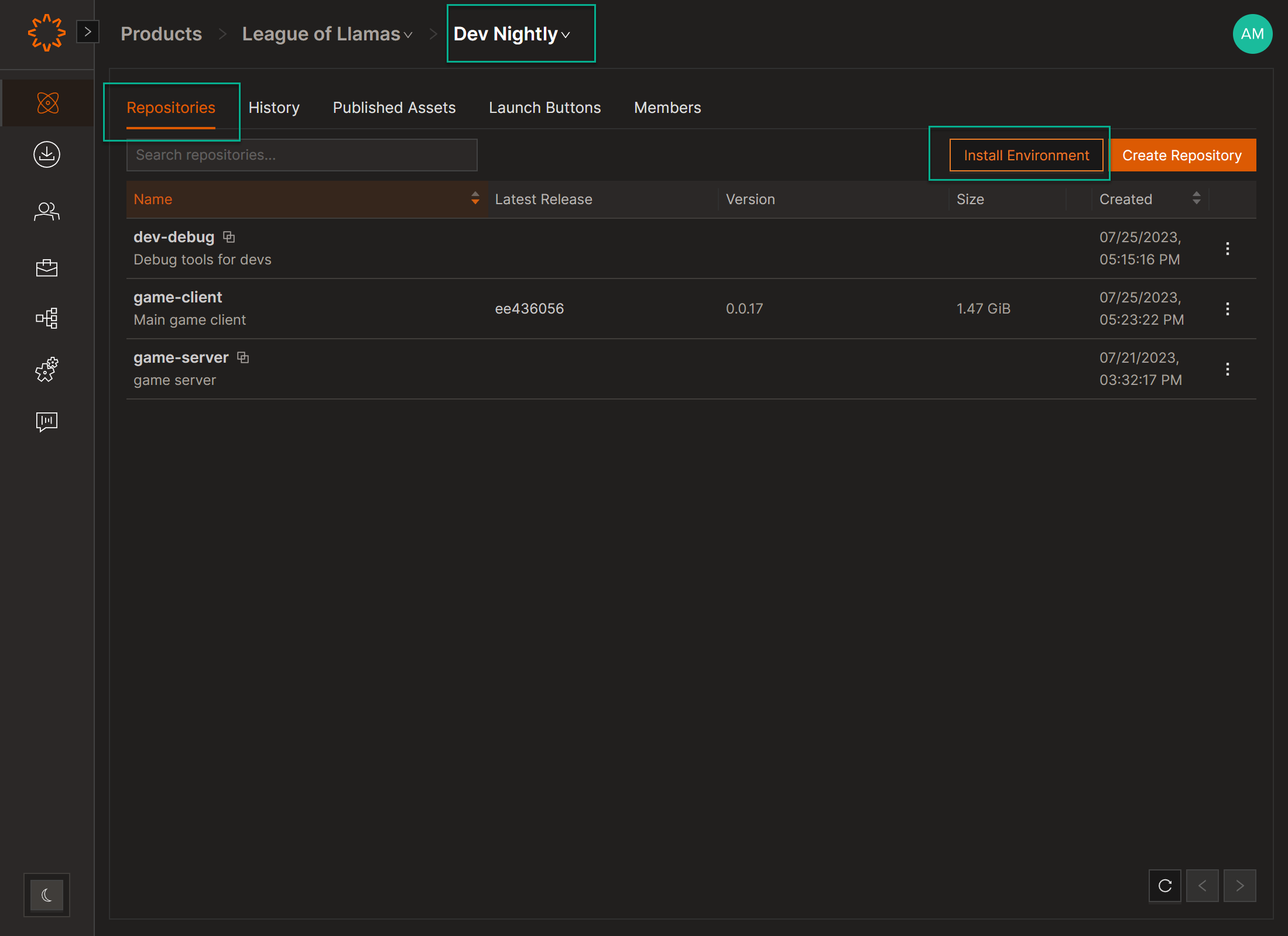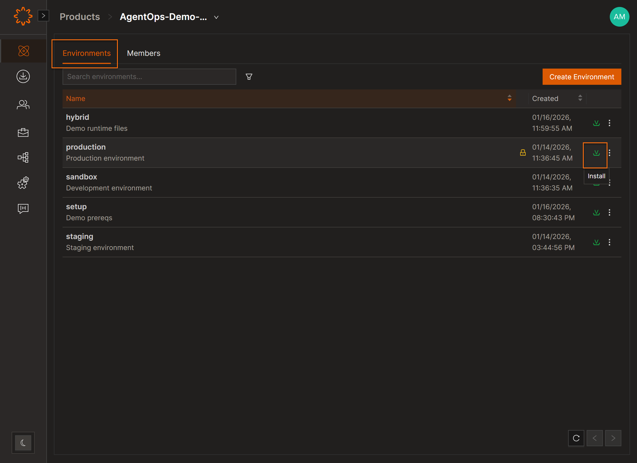 - Click Install next to the desired Environment.