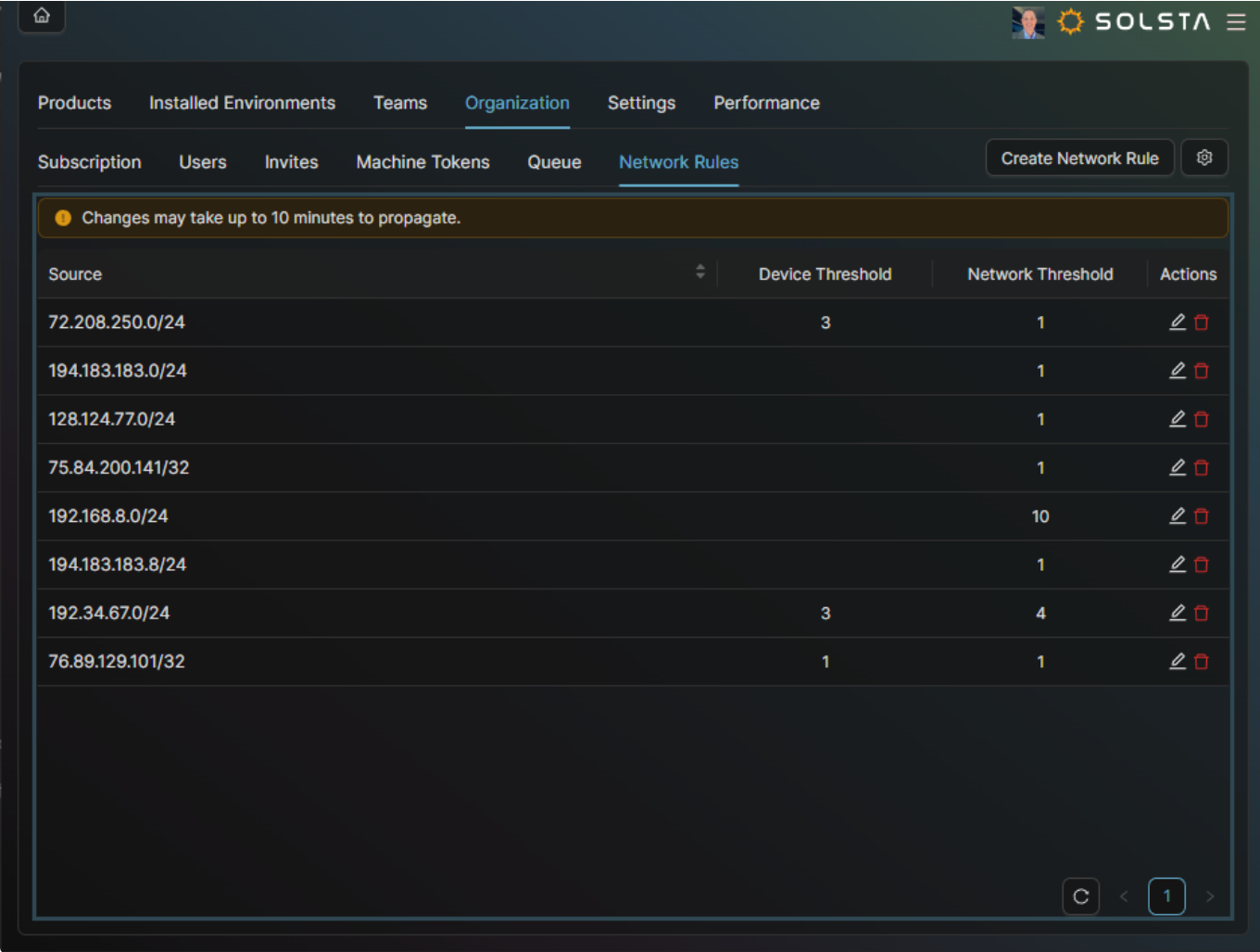 - From the Network Rules sub-tab, find the rule you want to edit and click the Edit icon from the Actions column. This brings up the Edit Network Rule modal window.