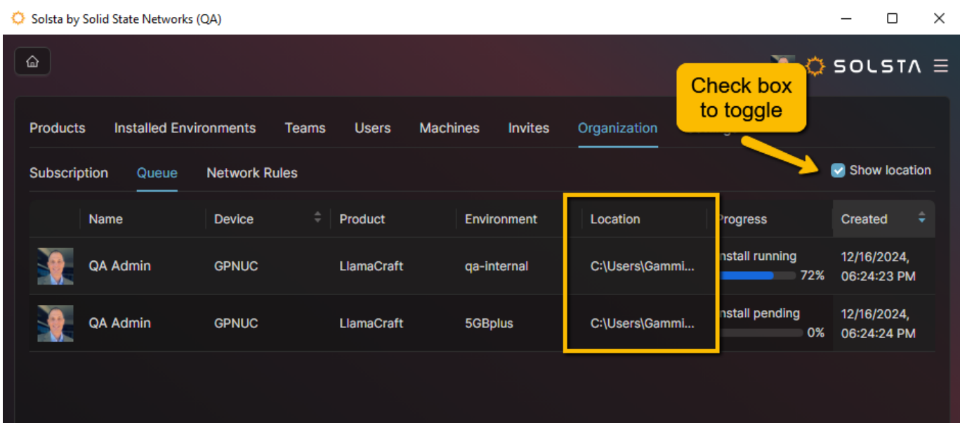 From this screen, an Organization Administrator can click on the Show location box on the top left of the UI to toggle the Location field on/off for each download in the queue.