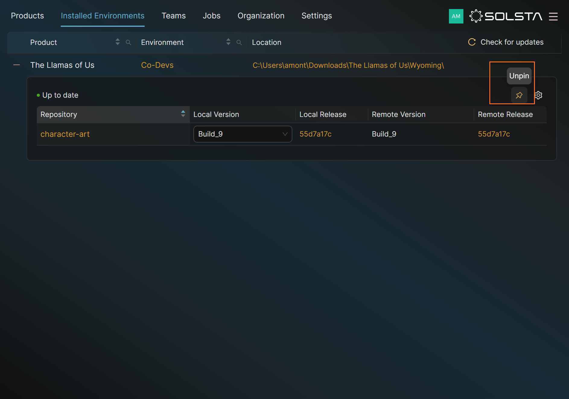 Pinning keeps key environments at the top of your Installed Environments list for quick access. This is useful when managing multiple installs or frequently switching between builds.