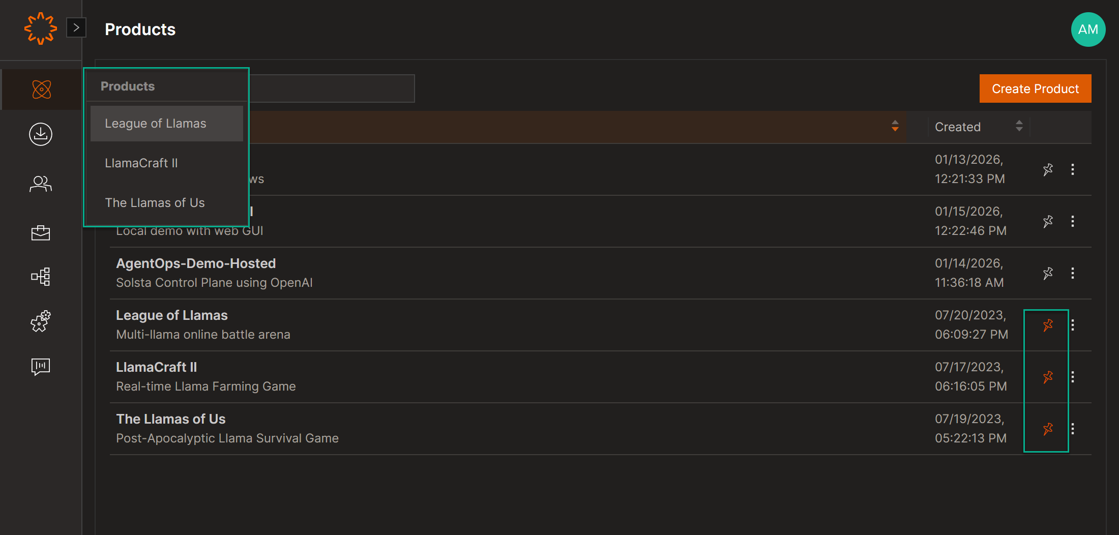 Pinned products appear in your sidebar menu for faster access — similar to a favorites list.