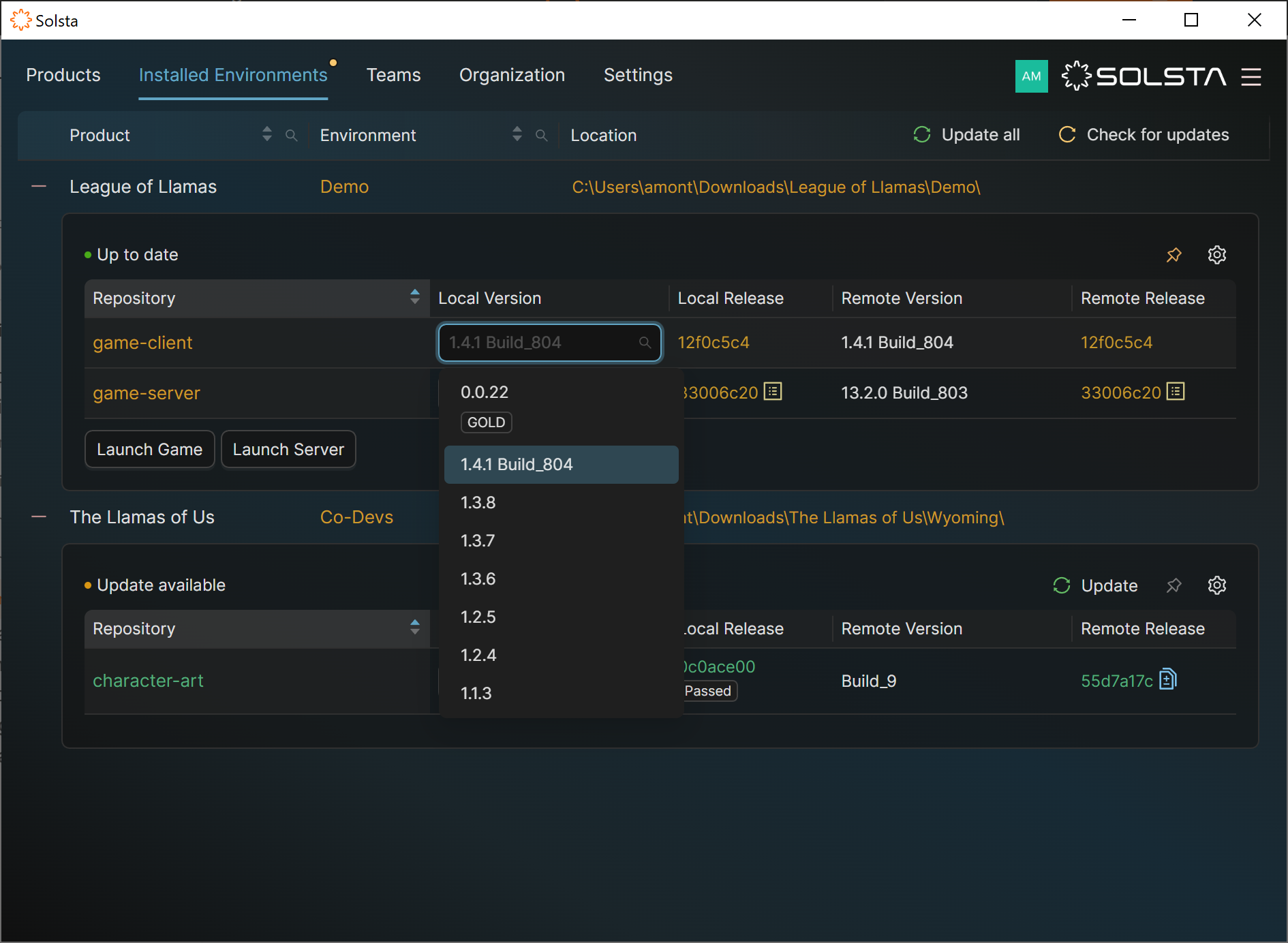 Solsta lets you sync, roll forward, or roll back to specific release versions for each repository in an environment — ideal for testing older builds or restoring stable versions.