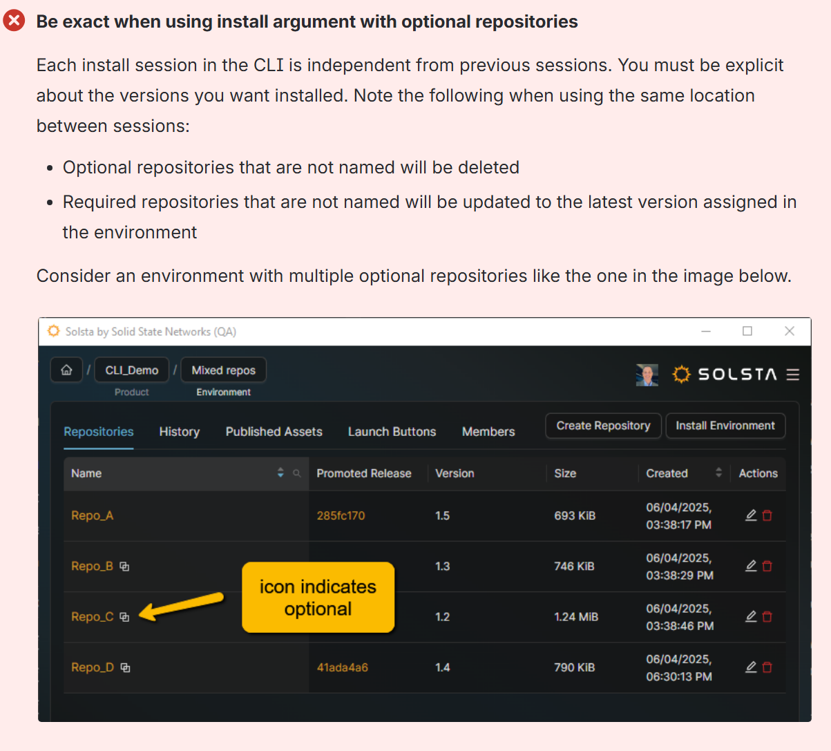 When you install an environment using the CLI using only the product and environment information, only the required repositories are included in the installation. To include optional repositories in the installation, you must specify both the name of the optional repositories and a release version (or use “latest” - see below for details).