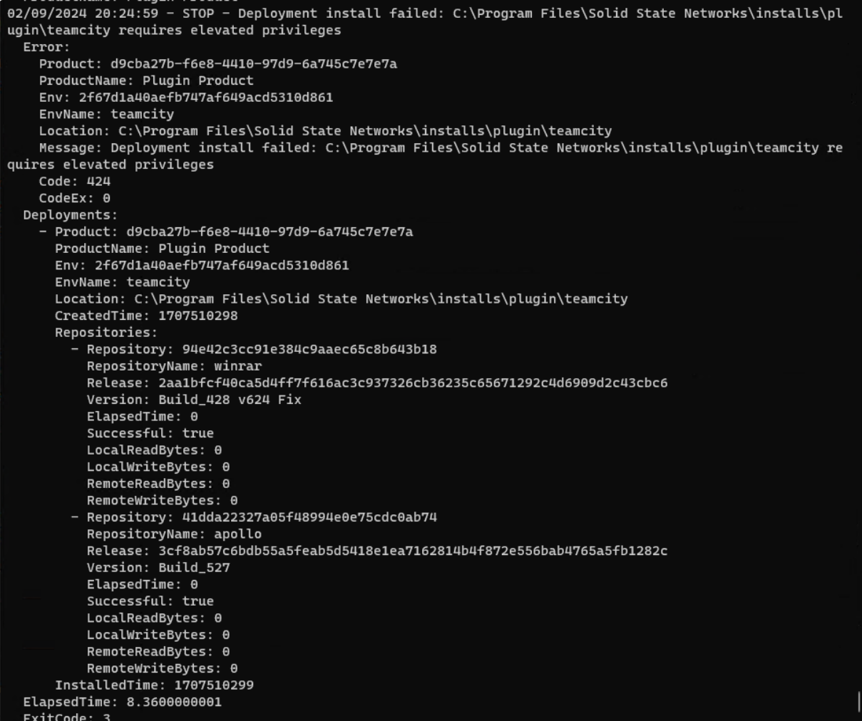{"timestamp":1707510586,"type":"STOP","deployments":[{"product":"d9cba27b-f6e8-4410-97d9-6a745c7e7e7a","productName":"Plugin Product","env":"2f67d1a40aefb747af649acd5310d861","envName":"teamcity","location":"C:\\ssn\\solsta\\installs\\plugin\\teamcity\\","createdTime":1707510579,"repositories":[{"repository":"94e42c3cc91e384c9aaec65c8b643b18","repositoryName":"winrar","release":"2aa1bfcf40ca5d4ff7f616ac3c937326cb36235c65671292c4d6909d2c43cbc6","version":"Build_428 v624 Fix","elapsedTime":2.82799999998,"successful":true,"localReadBytes":3589048,"localWriteBytes":0,"remoteReadBytes":3408903,"remoteWriteBytes":3680},{"repository":"41dda22327a05f48994e0e75cdc0ab74","repositoryName":"apollo","release":"3cf8ab57c6bdb55a5feab5d5418e1ea7162814b4f872e556bab4765a5fb1282c","version":"Build_527","elapsedTime":2.92200000002,"successful":true,"localReadBytes":6186047,"localWriteBytes":0,"remoteReadBytes":6143214,"remoteWriteBytes":11040}],"installedTime":1707510586}],"elapsedTime":13.9539999999,"exitCode":0}status_interval