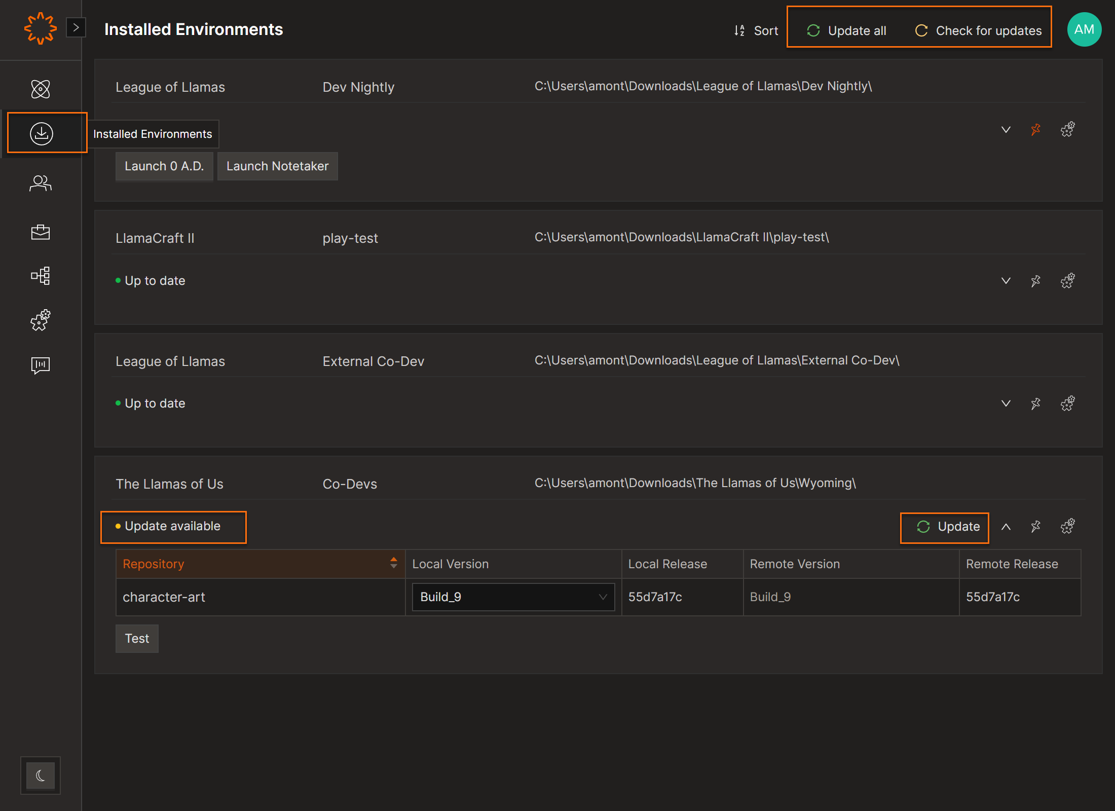 View and manage installed Environments from the Installed Environments screen.